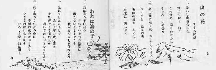 | ~目次~ 新人哀歌 山の花 われは海の子 海 茶摘 鎌倉 春の小川 村の鍛冶屋 蛍の光 戦友 野菊 きたえる足に オレンヂ娘 青葉茂れる桜井の 箱根八里 孤独の山男 ずいずいすっころばし おおえやま 牛若丸 四季の雨 蛍 虫の楽隊 金髪のジョニー オールドブラックジョー 一寸法師 ダンカングレイ 白いバラ 禁じられた遊び 草原に リンゴ娘 牧場の朝 母の歌 すてきな娘さん 僕等の歌 シーハイルの歌 このハンマーをとれ 囚人の歌 祖国の歌 コサックはく口笛吹いて たちあがれ インターナショナル 平壌は心のふるさと 世界をつなげ花の輪に みんなが笑う日まで 沖縄を返せ 俺は旋盤工 この勝利ひヾけ、とどろけ われらは勝つ 東京の朝の歌 ![]() |