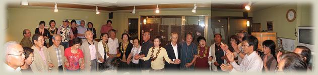 今年の趣向は、レイ トミの素敵な女性陣にレイが用意されており、こんな感じに。 そうそう、開始前にウスイさんが「トミ風にみんなで立って歌いましょう。でも、場所が狭いから椅子の上にでも立って」何て言うもんだから、本当に、椅子の上に立ちあがってしまいました。火付け役は、日野のうたごえのマエダさん! 来年は机の上? |