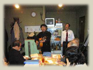 行ってきました 10月20-21日 新宿歌舞伎町「カチューシャ」が閉店(平成13年6月30日)後の9月から、アコーディオン奏者の小倉義雄先生を囲み歌声をと、多くの仲間たちで歌い続けて、もう五年が過ぎました。小倉先生の85歳と五年目を祝って、おおいに楽しむ会が開催されました。 初日のゲストがヤギさんこと、青柳常夫さん。 いつもは小型アコでの演奏ですが、この日は珍しくギターでした。 |